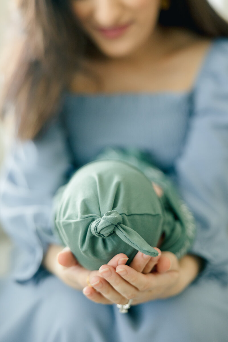 Brightly colored clothing can create unflattering casts on the delicate newborn skin, so a neutral palette is always best. If your little one is wearing a special outfit, I recommend waiting to change into it until after I arrive to avoid spit-up or blow-outs!